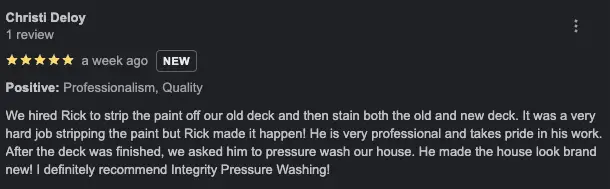 We hired Rick to strip the paint off our old deck and then stain both the old and new deck. It was a very hard job stripping the paint but Rick made it happen! He is very professional and takes pride in his work. After the deck was finished, we asked him to pressure wash our house. He made the house look brand new! I definitely recommend Integrity Pressure Washing!